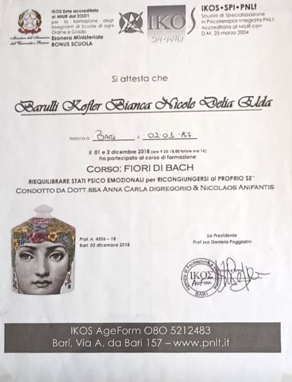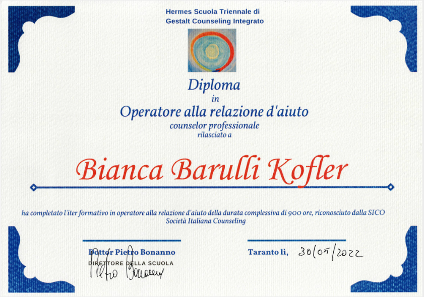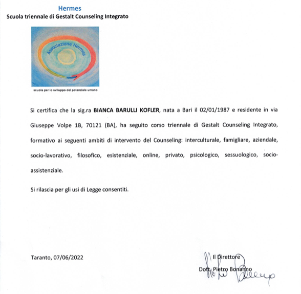 Ho completato un percorso triennale in "Gestalt Counseling Integrato" presso la scuola Hermes di Taranto, con approfondimenti negli ambiti esistenziale, socio-lavorativo e aziendale. L'interesse per i processi emotivi e per le dinamiche identitarie mi ha portata ad approfondire la relazione d'aiuto in modo strutturato.